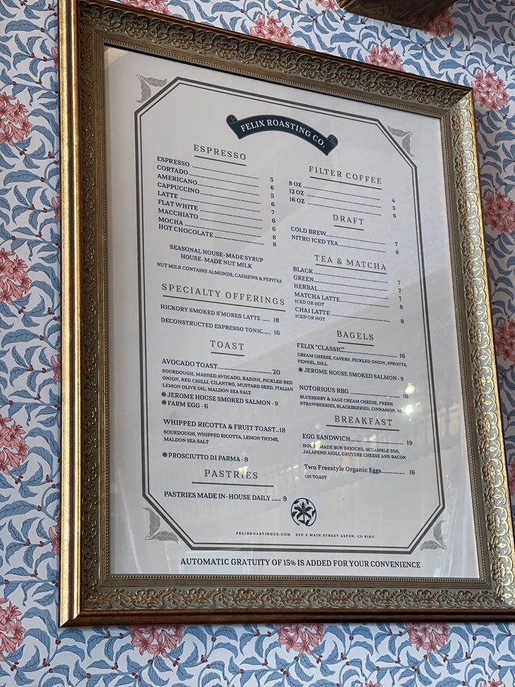 Felix Roasting Company, located in Aspen, CO, offers a classy atmosphere for coffee and tea lovers. Customers rave about the delicious in-house pastries, particularly the Swiss chocolate croissant and avocado toast. The café's feminine decor and attention to detail create a dreamy ambiance. The friendly staff and quick service contribute to a pleasant dining experience. While the oat latte and espresso croissant are popular choices, the menu also features unique drinks like the hickory smoked s'mores latte. Overall, Felix Roasting Company stands out for its quality coffee, artisanal pastries, and upscale setting, making it a must-visit spot in Aspen.